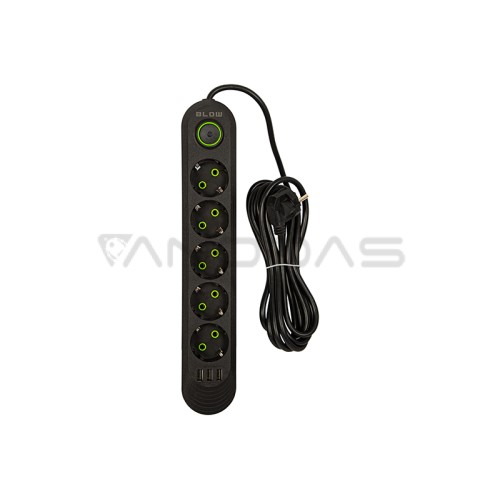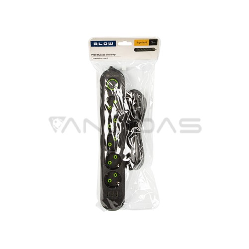 BLOW maitinimo ilgintuvas juodos spalvos su penkiais lizdais, skirtas naudojimui namuose. Prailginimo laidas leidžia prijungti įrenginius, kurie yra toli nuo elektros lizdo. Vienoje gaminio pusėje yra 5 kampu pasukti kištukiniai lizdai ir jungiklis, o kitoje – vienas kampuotas maitinimo kištukas.