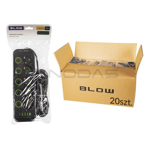 BLOW juodas elektros tinklo prailgintuvas su penkiais lizdais, skirtas naudoti namuose. Ilgintuvas leidžia prijungti įrenginius, esančius toli nuo elektros lizdo. Gaminys vienoje pusėje turi 5 kampinius lizdus ir jungiklį, o kitoje – vieną kampinį elektros tinklo kištuką.