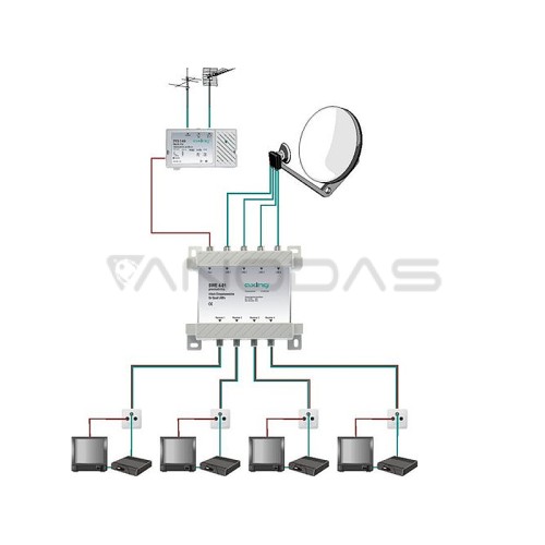 Kombinuotojas leidžia sumuoti Quad LNB signalą su antžeminės televizijos signalu ir nusiųsti į keturis RTV SAT lizdus. Kombinuotojas turi labai platų atskirų įėjimų filtravimą, todėl įrenginys labai gerai atskiria SAT ir TV įvestis. Keturių dažnių keitiklis yra keturių visos juostos keitiklių rinkinys, patalpintas viename korpuse. Kiekvienas iš šių keitiklių, žinoma, turi atskiro valdymo galimybę. Todėl prie įrenginio galima prijungti keturis nepriklausomai veikiančius palydovinius imtuvus. Įrenginys taip pat suteikia prieigą prie antžeminės televizijos signalų.