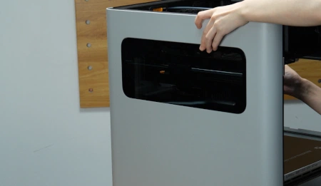 Kairysis šoninis stiklas, skirtas „Bambu Lab H2D“ ir „H2C“ spausdintuvams, yra originali atsarginė dalis su pilkai permatomu stiklu ir integruotu Holo efekto jutikliu, skirtu aptikti uždarymo padėtį. Šis keičiamas korpuso elementas užtikrina spausdintuvo saugumą ir visišką funkcionalumą.