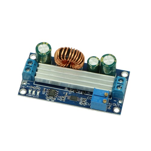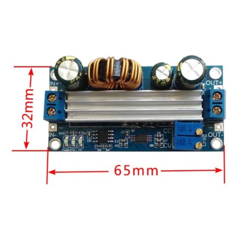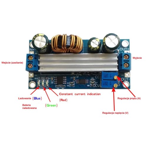 Keitiklis yra CC/CV modulis, tai reiškia, kad keitiklio išėjime galime reguliuoti srovę ir įtampą. Ši funkcija leidžia šį modulį naudoti kaip akumuliatoriaus įkroviklį. Norėdami tinkamai sukonfigūruoti keitiklį, potenciometru nustatykite išėjimo įtampą. Tada įkraukite keitiklio išėjimą srovės matuokliu ir nustatykite norimą maksimalią išėjimo srovės vertę. DĖMESIO – ilgai kraunant skaitiklį galima jį sugadinti.