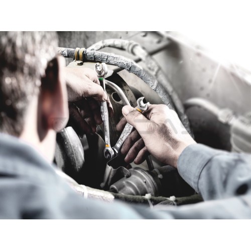 Aukštos kokybės metrinis reketinis kombinuotas veržliaraktis: viskas, ką turi suteikti veržliaraktis. Ir dar daugiau. Greičiau, geriau, saugiau. Taip veikia Džokeris. Naujos kartos reketiniai kombinuoti veržliarakčiai. Varžtams ir veržlėms su šešiakampe galvute. Laikymo funkcija su metaline plokšte sumažina varžto ar veržlės pametimo riziką. Labai kieti keičiamos plokštės dantys tvirtina varžtus ir veržles bei sumažina veržliarakčio paslydimo riziką. Integruotas stabdys neleidžia raktui nuslysti nuo varžto galvutės ir leidžia perduoti didelius sukimo momentus. Dvigubas šešiakampis profilis užtikrina nepriekaištingą veržliarakčio ir varžto arba veržlės jungtį, taip sumažinant paslydimo riziką. 30° darbo kampas pašalina daug laiko reikalaujantį rakto pasukimą. Itin smulkus žingsnis su 80 dantų užtikrina maksimalų lankstumą net siaurose erdvėse. Dėl specialios geometrijos perkeliami dideli sukimo momentai ir padidėja stiprumas lenkiant. Pagaminta iš aukštos kokybės chromo-molibdeno plieno su chromo-nikelio danga, apsaugančia nuo korozijos. Su „Take it easy“ įrankių paieškos sistema: dydžio spalvų kodavimas. Su „Take it easy“ įrankių paieškos sistema: dydžio spalvų kodavimas.